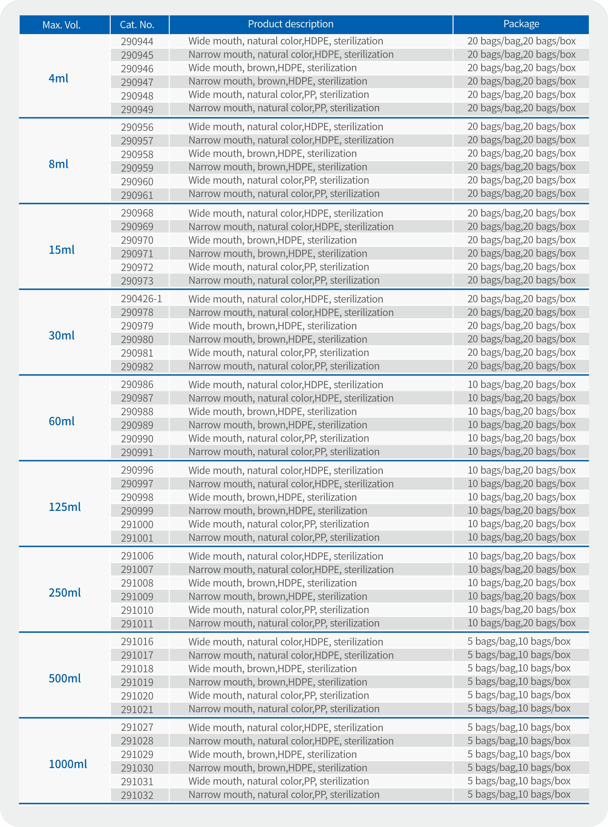 ※ Medical grade raw materials, produced in a 100000 level purification workshop, without nucleases or pyrogens ※ The unlined polypropylene bottle cap has excellent leak proof effect, and the narrow mouth sealing is better ※ Can withstand a pressure of 98kpa inside the bottle, without liquid leakage, meeting the requirements of air transportation ※ Super strong low-temperature resistance, can be used in freezers up to -100 ℃ ※ Rot bottle caps with torque measurement design, suitable for automated canning lines ※ Can be used for the storage of diagnostic reagents, chemical reagents, enzymes, buffer solutions, and other products